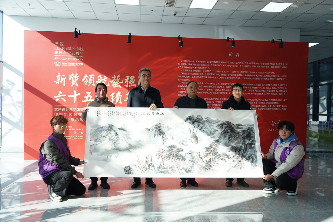 参观结束后,山东教育出版社向山东传媒职业学院赠送了青年艺术家们联合创作的中国画作品《崧高维岳》,以此表达对学院艺术教育发展的支持与美好祝愿。