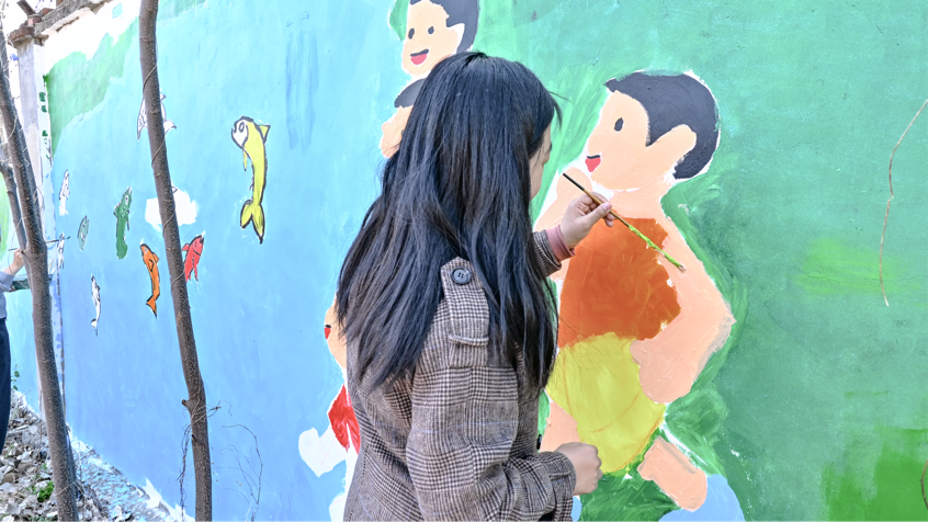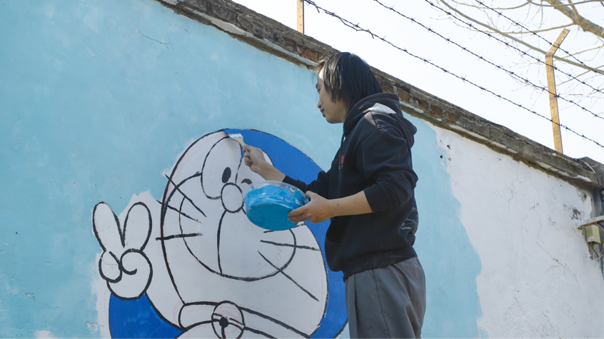 墙绘现场,志愿者们分工明确、配合默契,调色、勾线、填色有序推进。大家凝神聚力、精雕细琢,一笔一画反复斟酌打磨,力求呈现最佳视觉效果。山水风光、农耕文化等主题元素,在一面面白墙上鲜活绽放,原本朴素单调的墙面焕然一新,化身独具韵味的“文化长廊”。一幅幅匠心独具的墙绘作品,不仅成为村内一道靓丽风景线,更以直观形象的方式讲述乡村振兴故事。