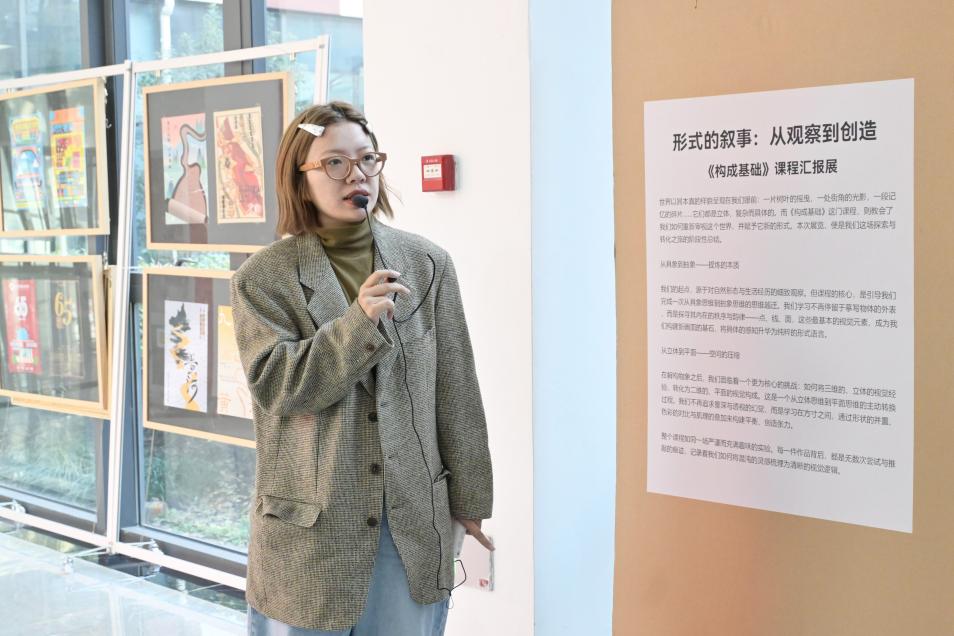 11月14日,艺术设计系25级视觉传达设计2班《构成基础》课程汇报展“形式的叙事:从观察到创造”在产教融合中心1楼正式开幕。本次展览由授课老师吕沼宣主持并策划,参展学生积极阐述创作理念,自信展示学习成果,展现出扎实的专业素养与清晰的表达能力,现场气氛热烈。