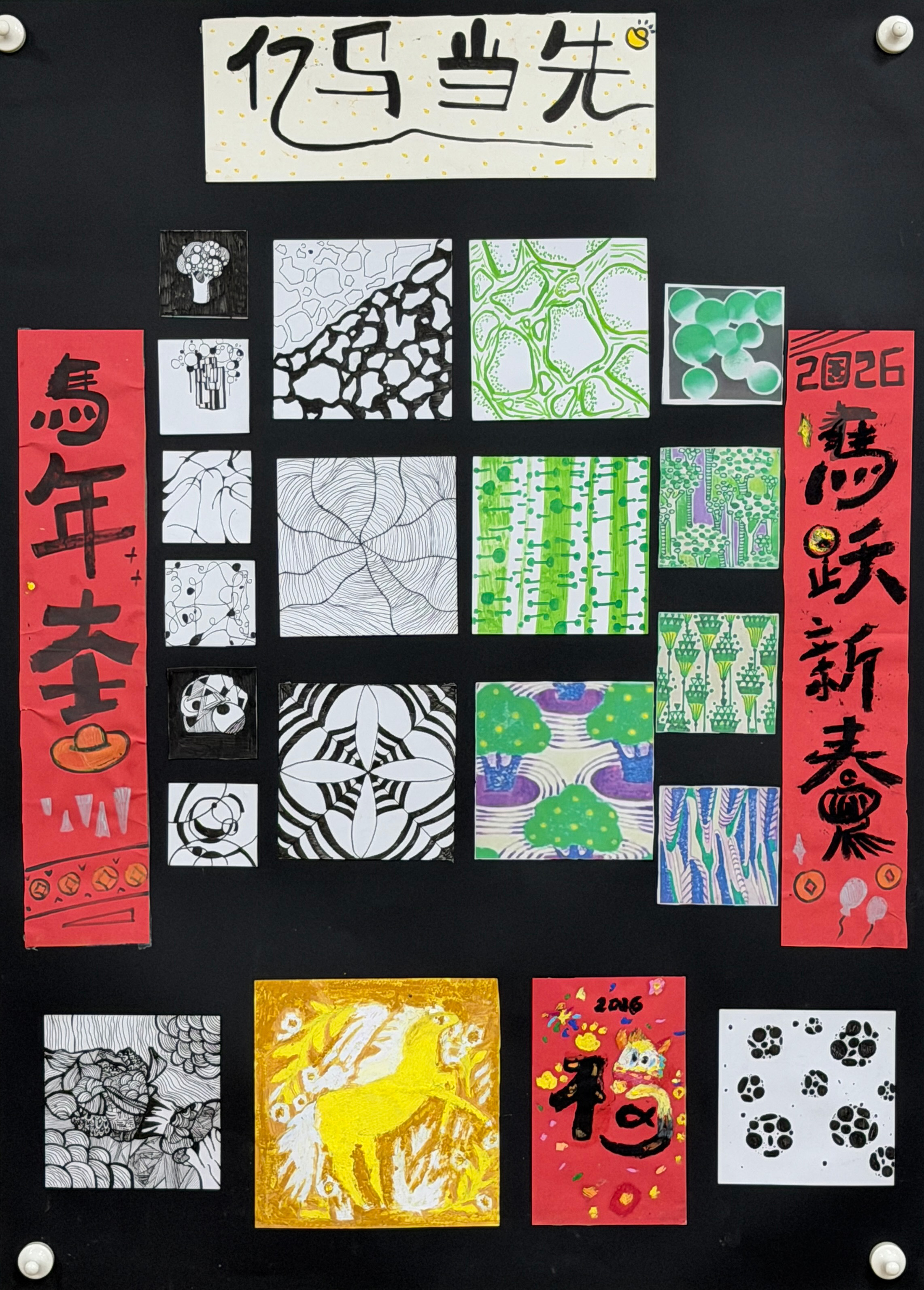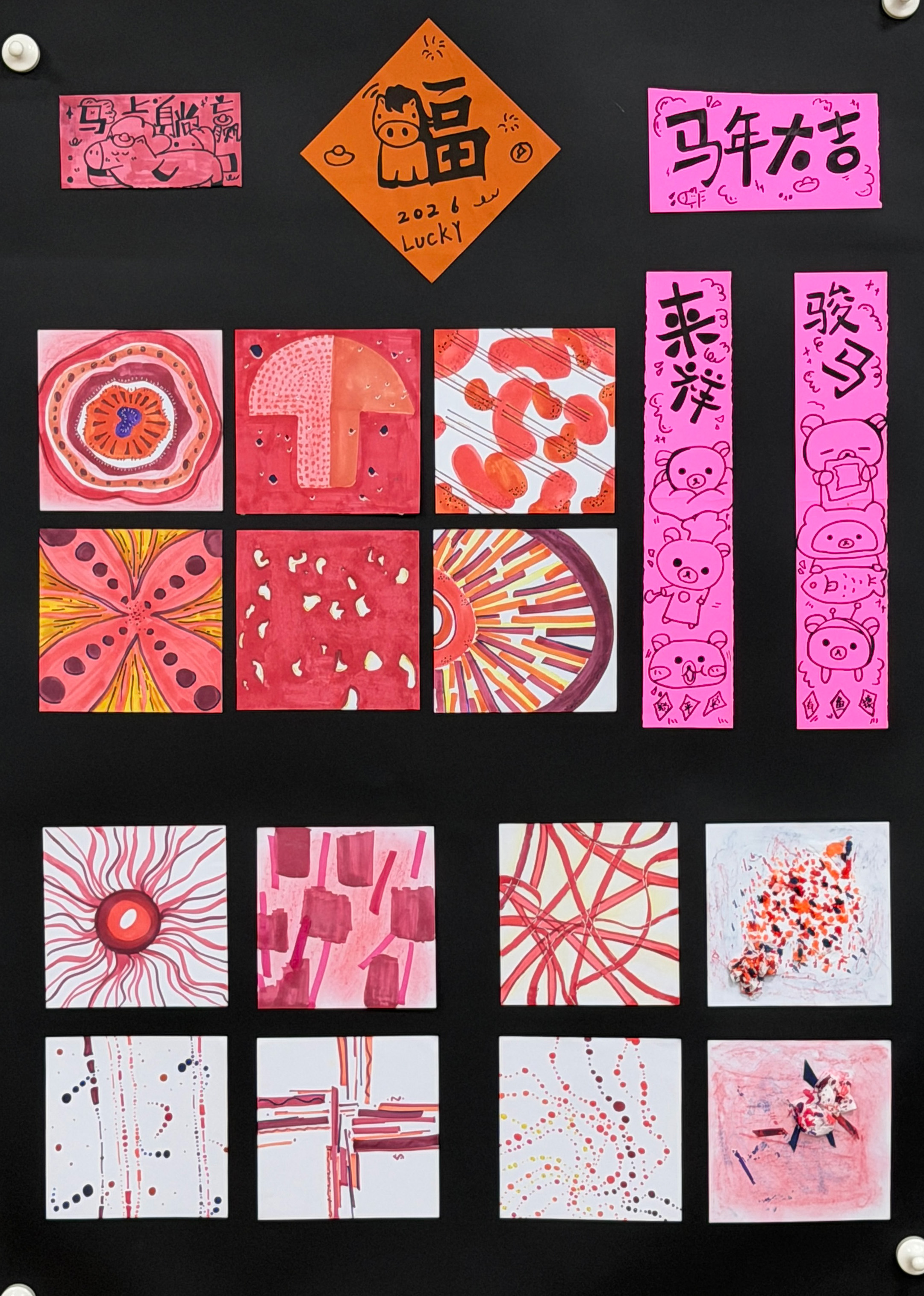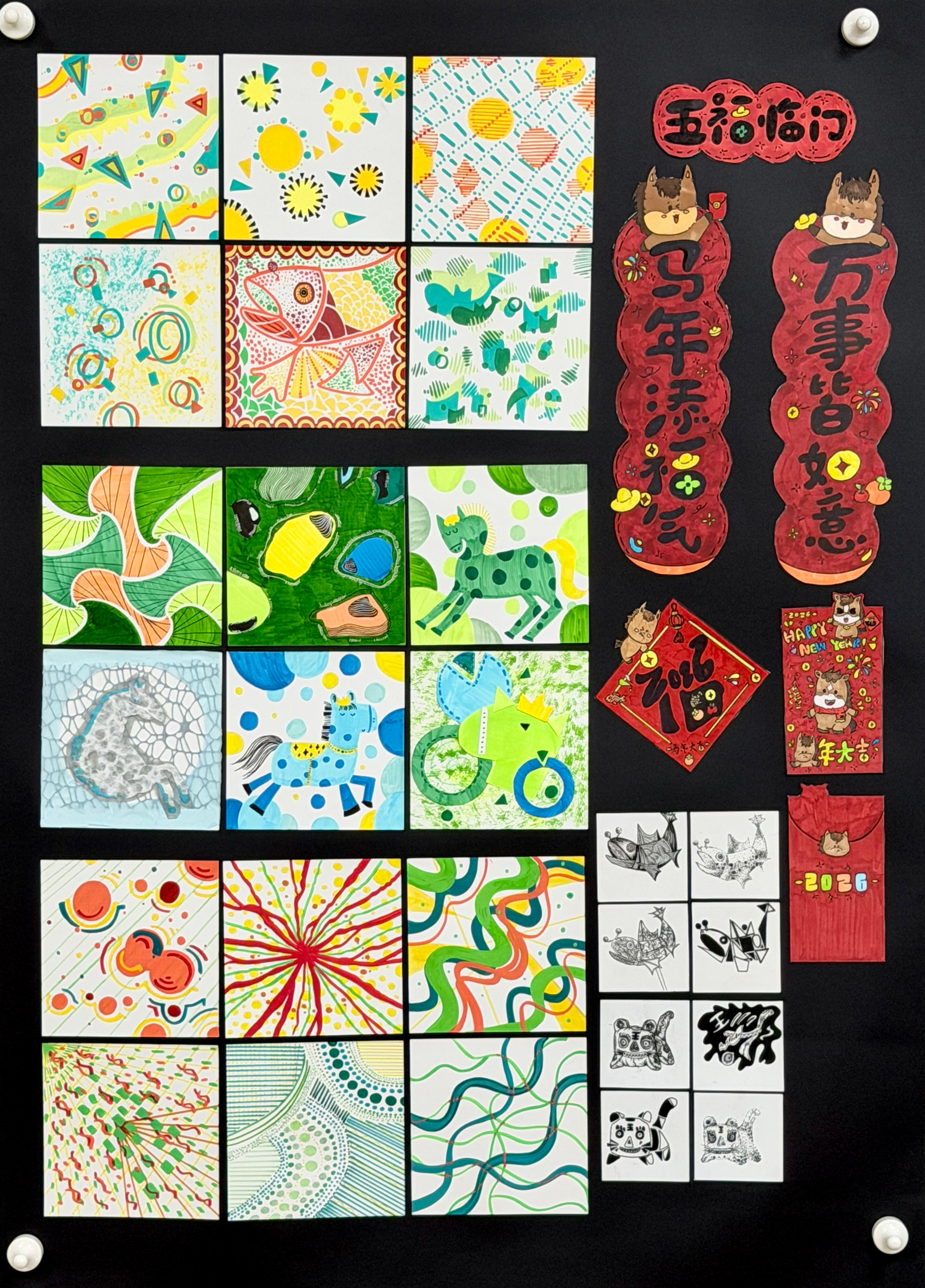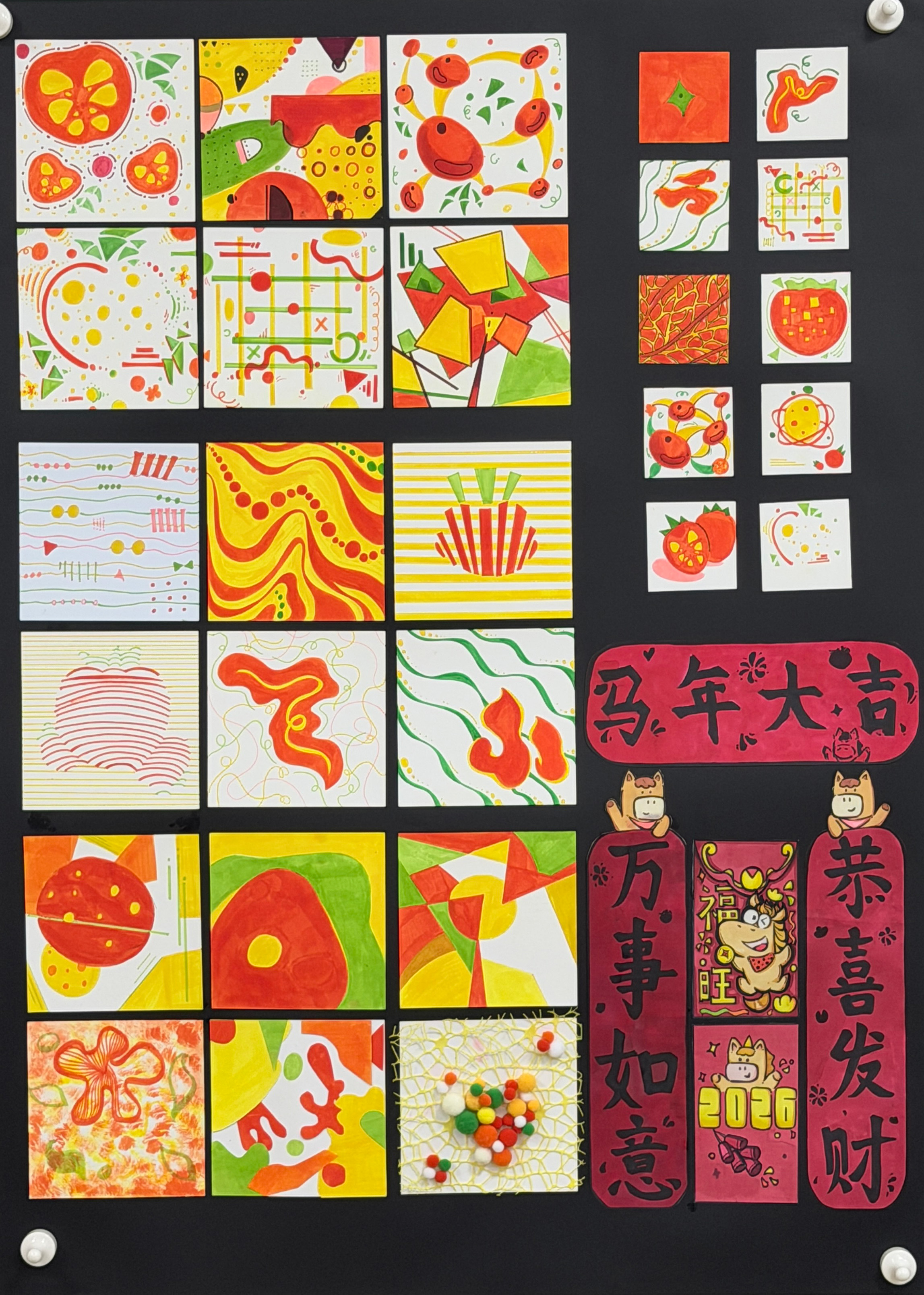 这一次,同学们在点、线、面的练习之外,完成了一次轻松而真挚的创作延伸:设计一张属于自己的年轻春联。这些实验创作满溢着属于这个时代的鲜活趣味与真诚心意。那些俏皮的文字、灵动的布局、大胆的用色,无一不是构成思维在生活温度中的自然流露。