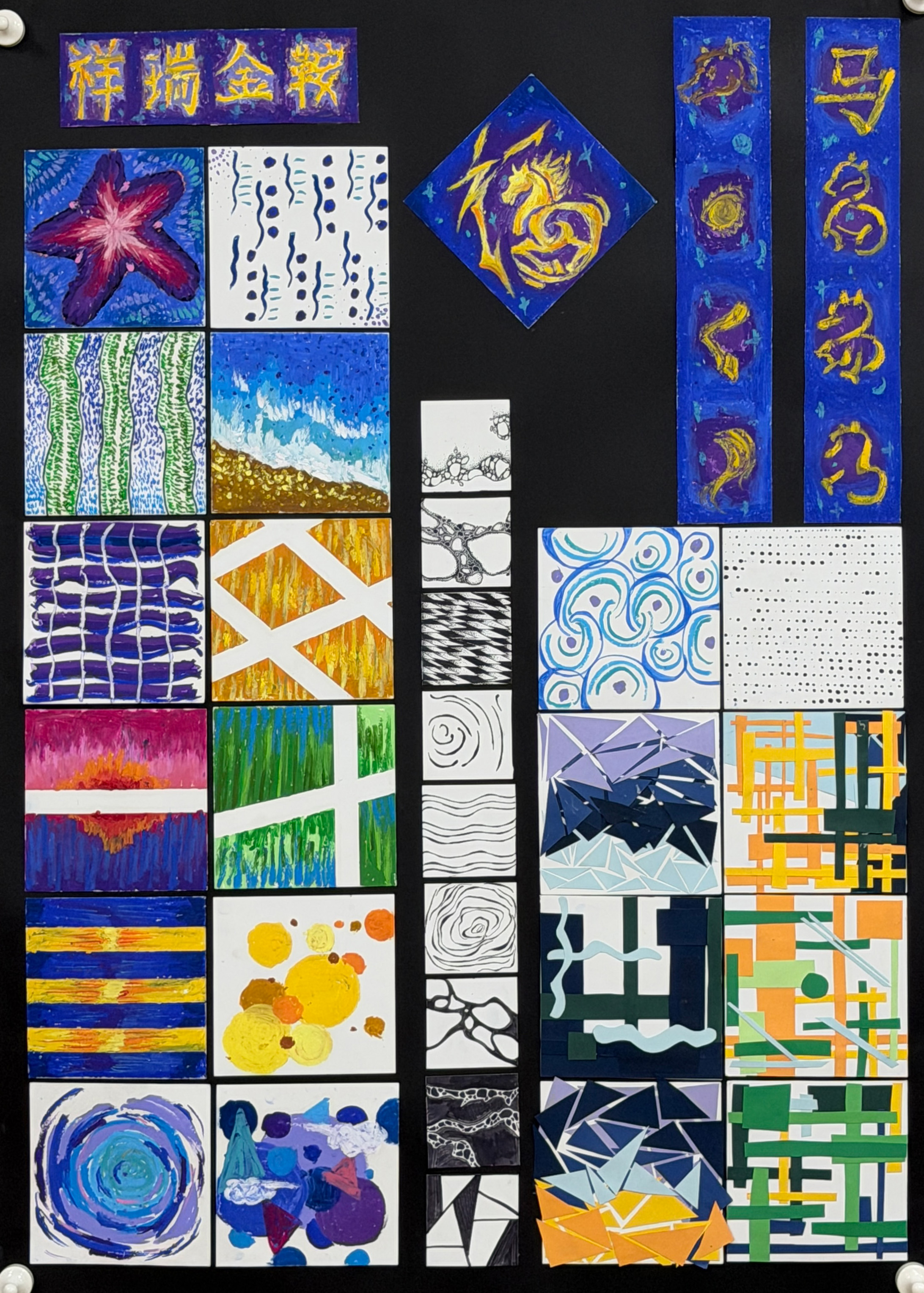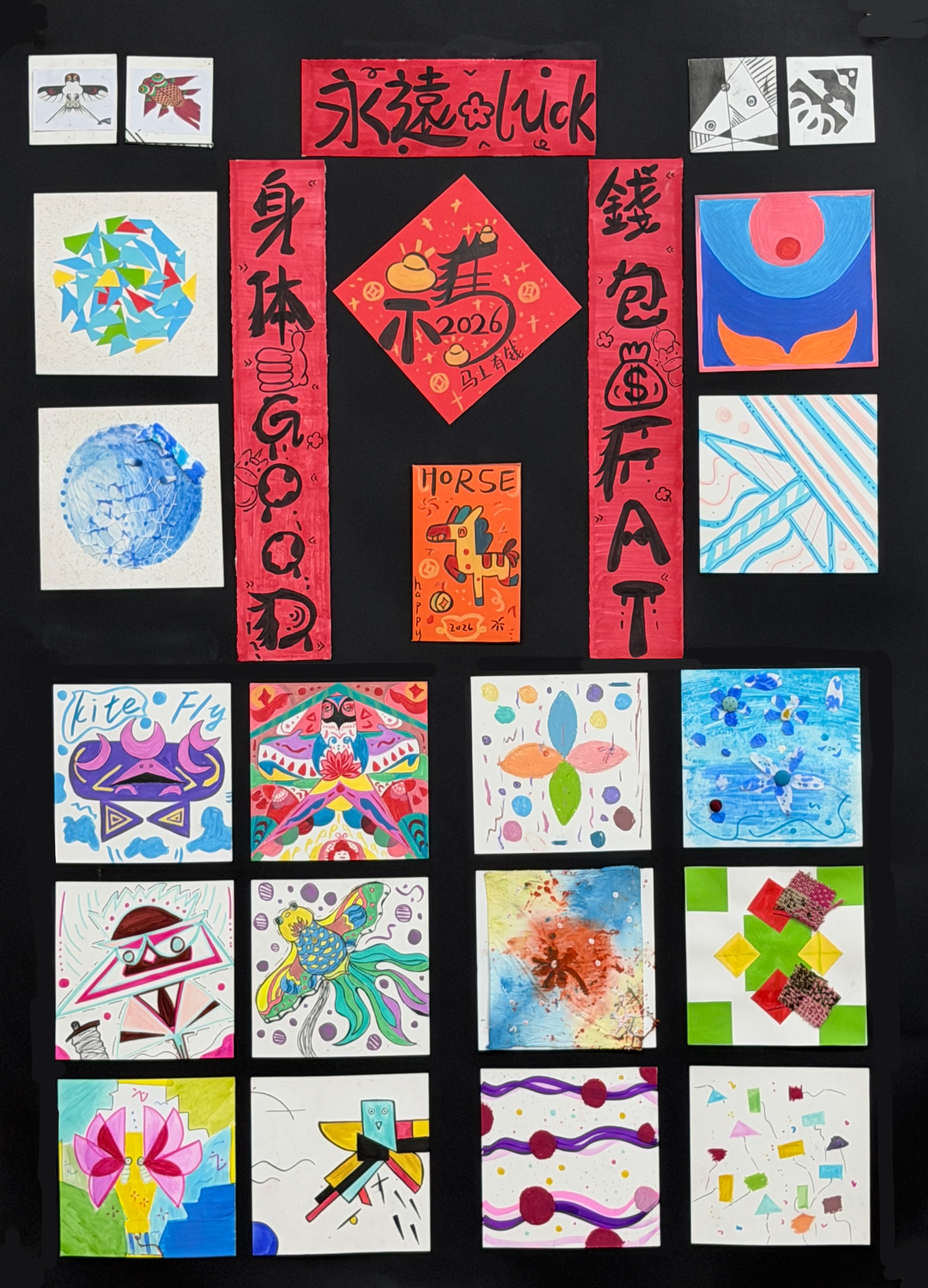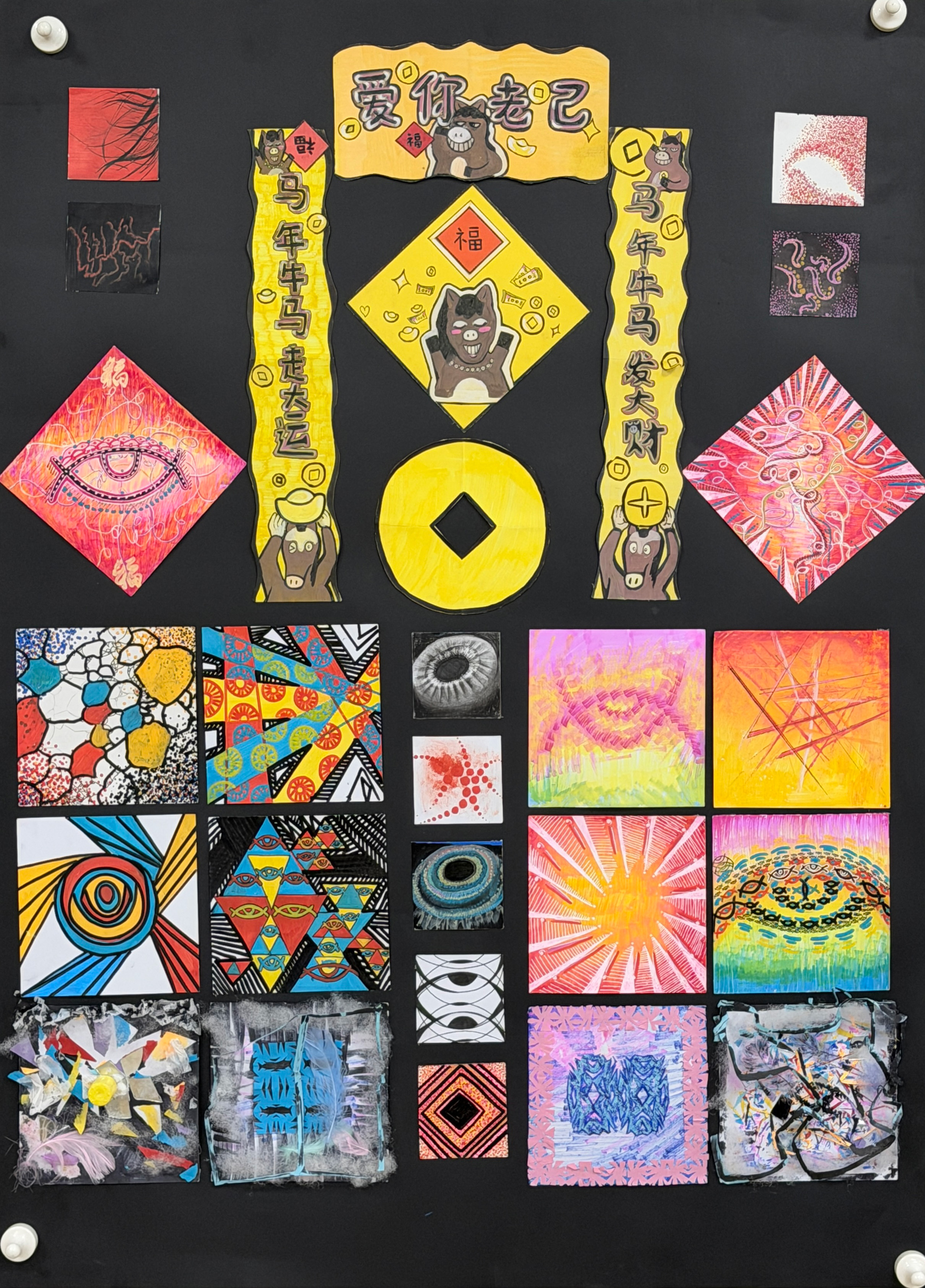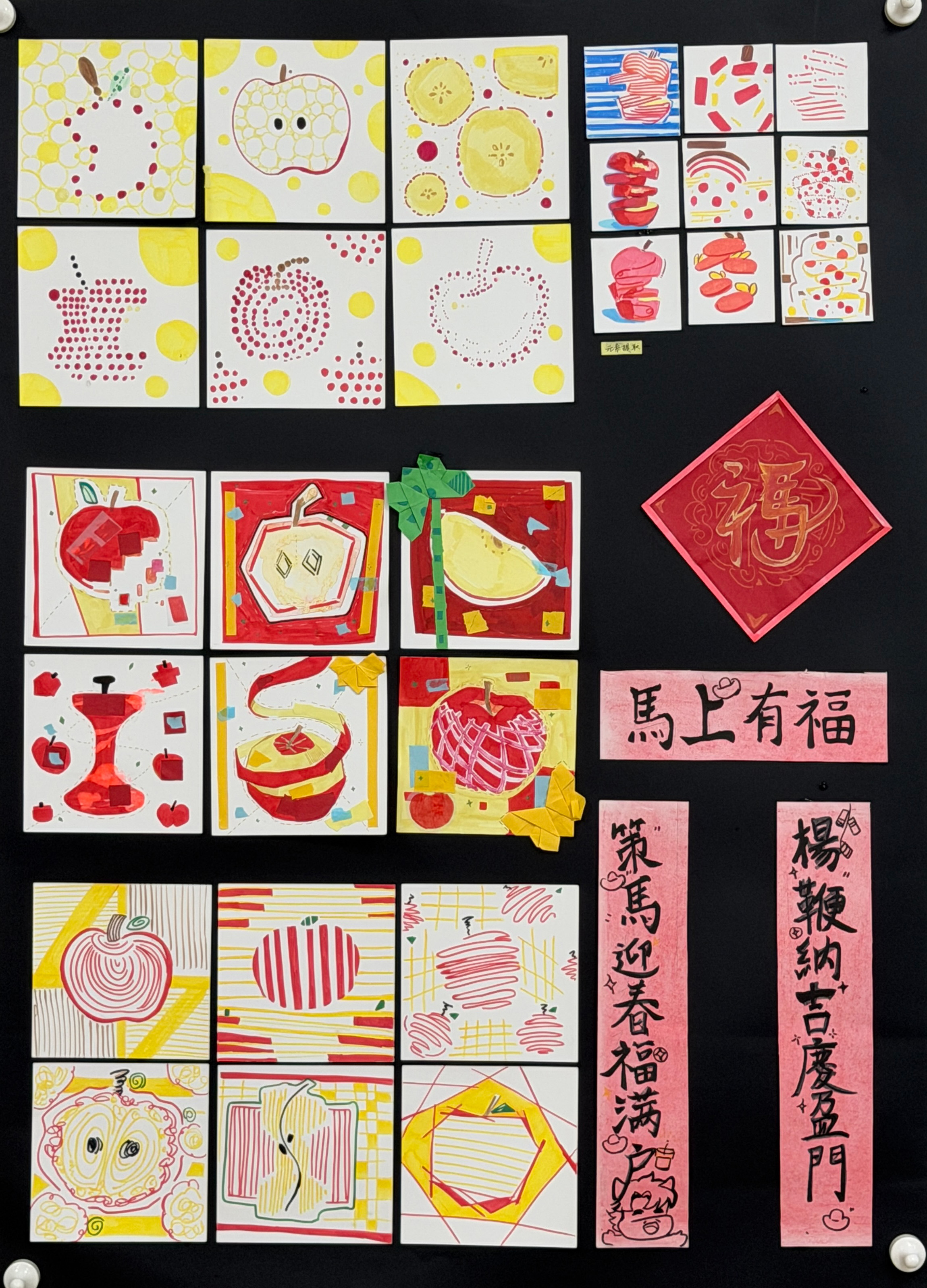 这一次,同学们在点、线、面的练习之外,完成了一次轻松而真挚的创作延伸:设计一张属于自己的年轻春联。这些实验创作满溢着属于这个时代的鲜活趣味与真诚心意。那些俏皮的文字、灵动的布局、大胆的用色,无一不是构成思维在生活温度中的自然流露。