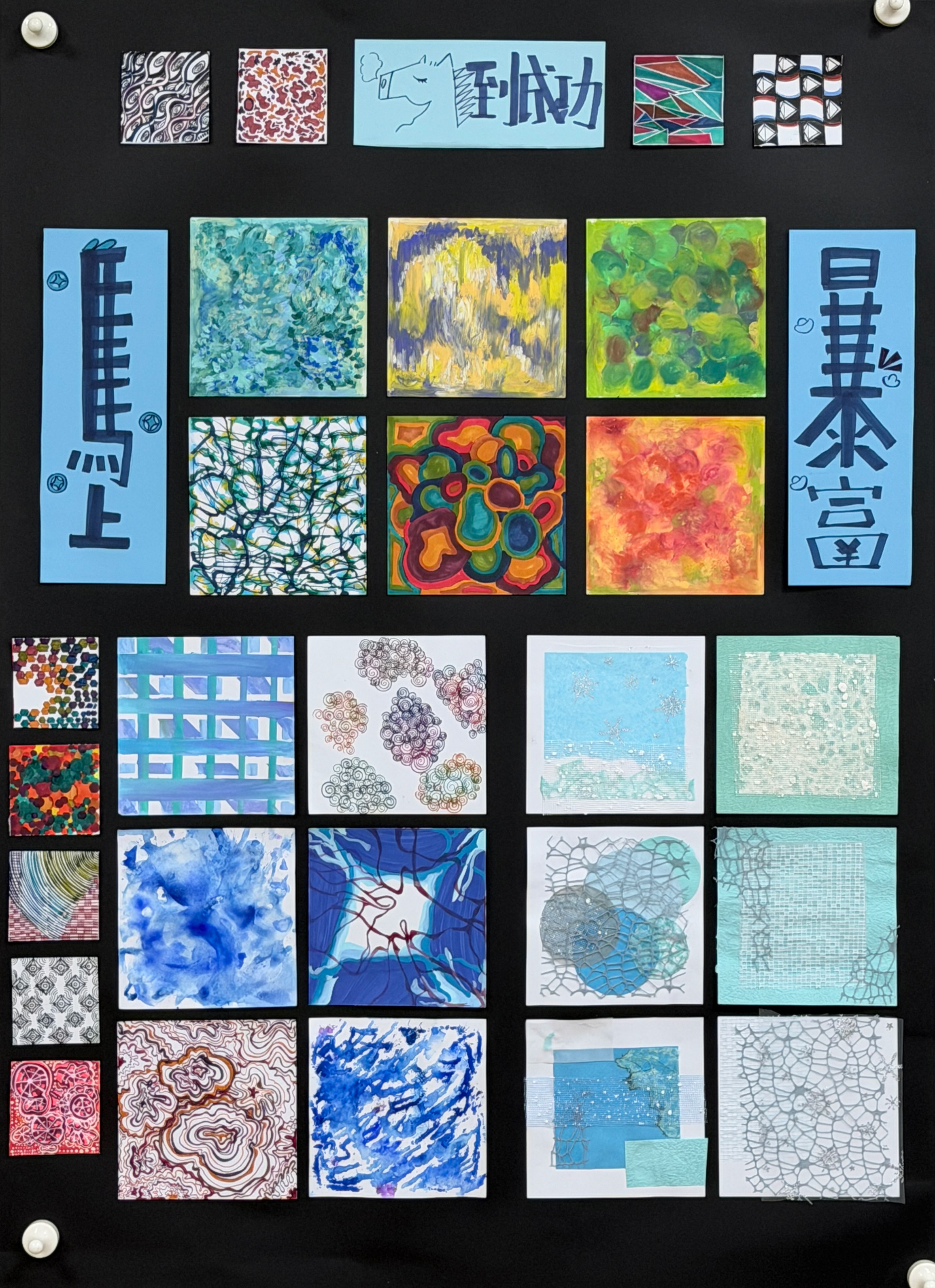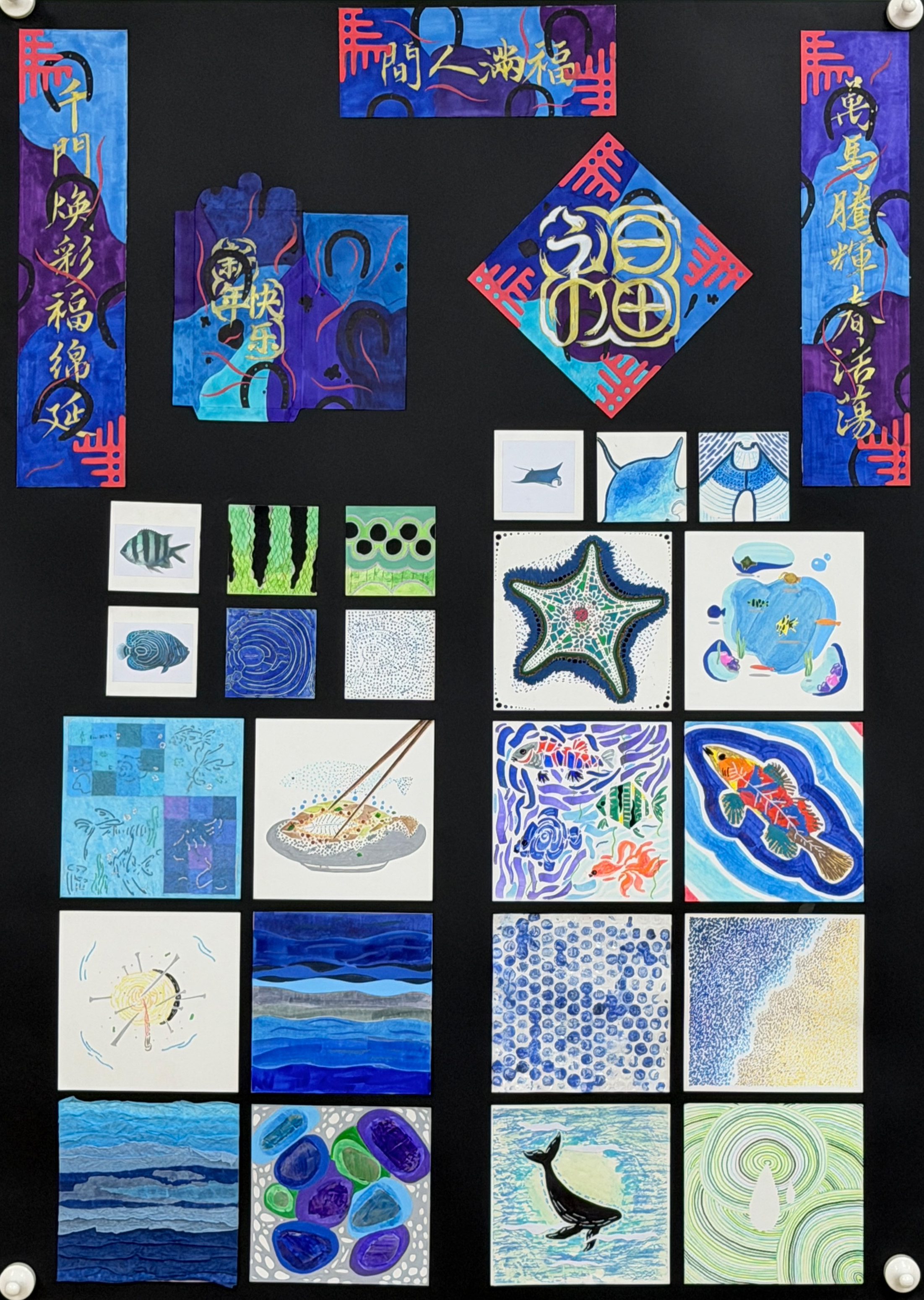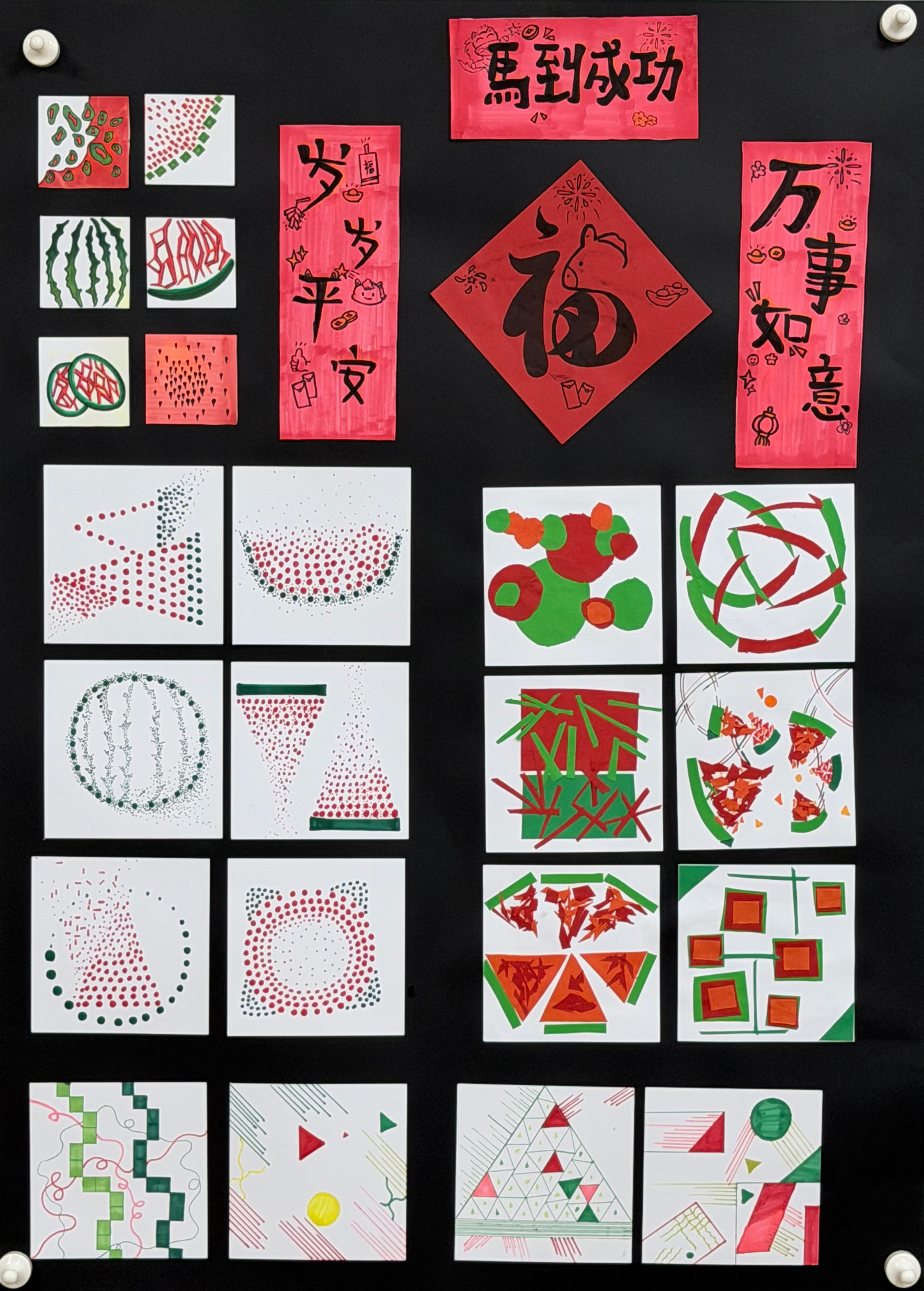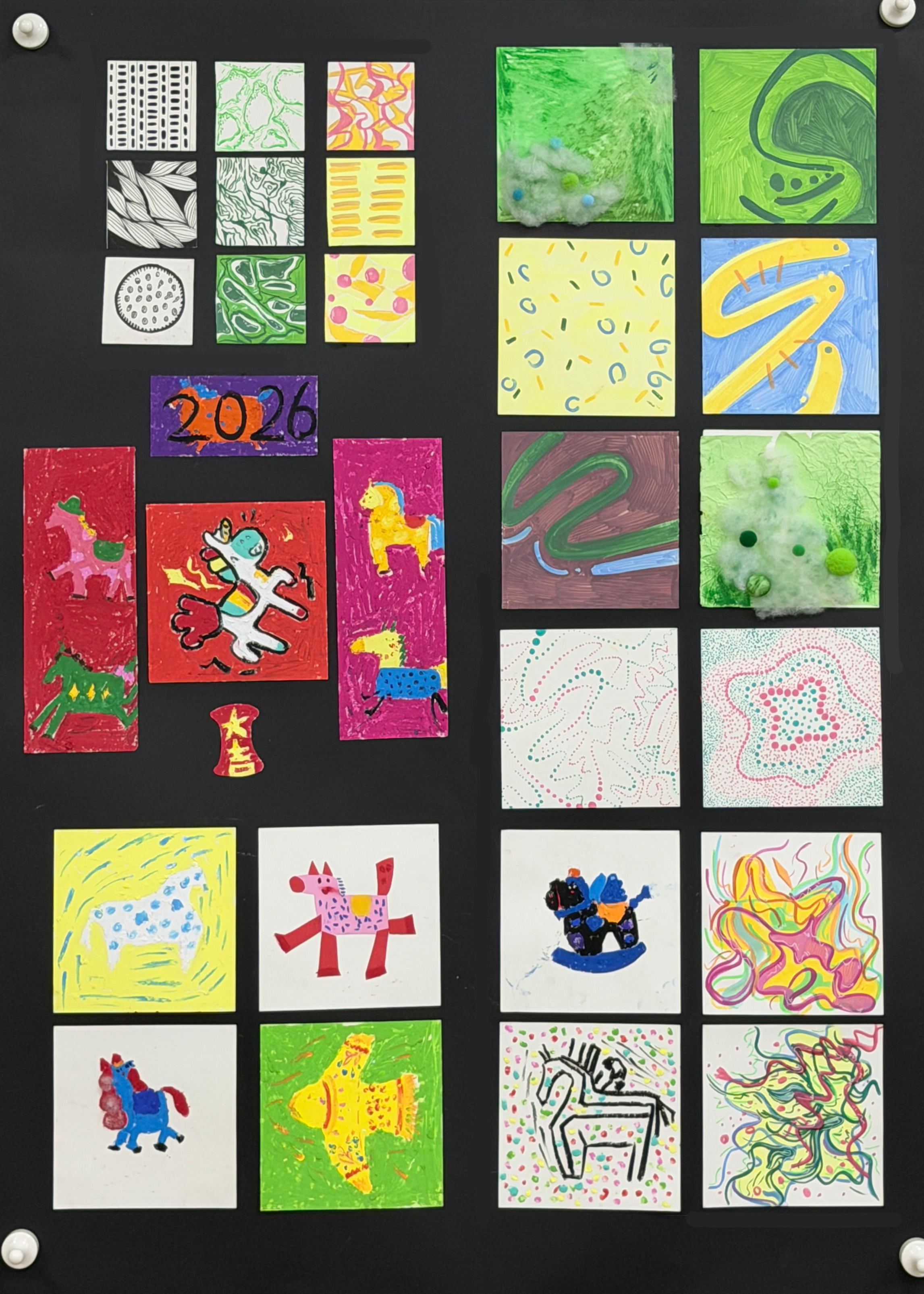 这一次,同学们在点、线、面的练习之外,完成了一次轻松而真挚的创作延伸:设计一张属于自己的年轻春联。这些实验创作满溢着属于这个时代的鲜活趣味与真诚心意。那些俏皮的文字、灵动的布局、大胆的用色,无一不是构成思维在生活温度中的自然流露。