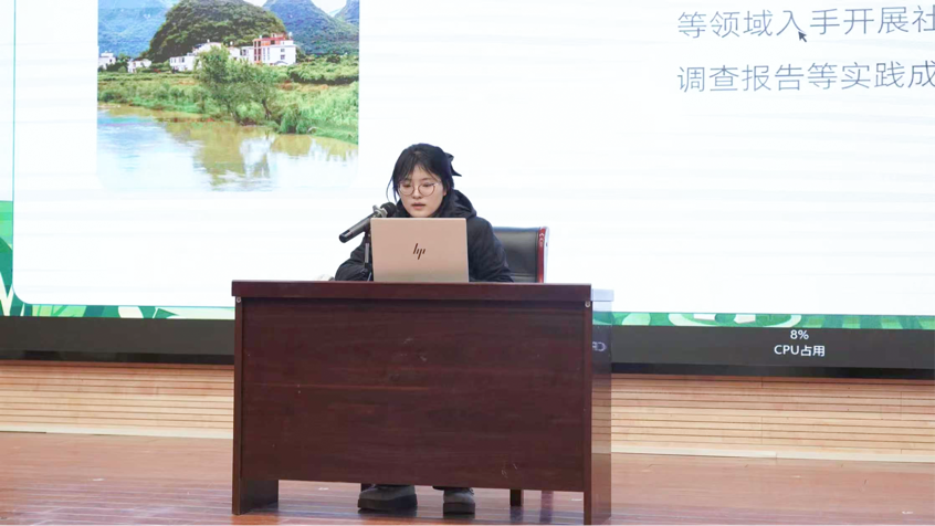 学生代表梁淑敏从寒假返家乡社会实践活动的目的、目标、原则、内容以及大学生申请参加的步骤方面进行讲述。