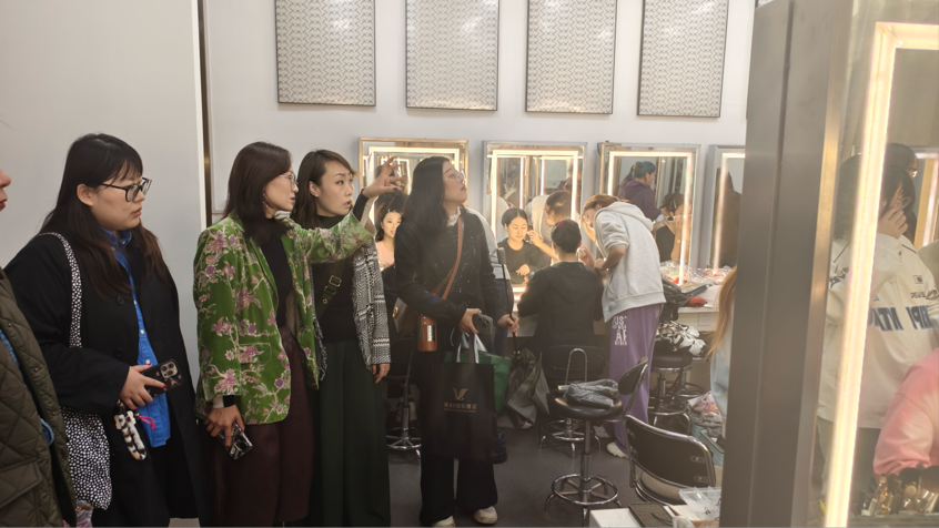 随后,考察团实地参观了该校戏剧影视美术设计专业实训中心、校企合作工作室及教学成果展示区,近距离观察了实训课程的开展情况,直观感受了其“教学-实践-就业”一体化的人才培养闭环。考察团成员结合自身教学与管理经验,就实训设备配置、课程内容与行业需求对接等问题与对方师生进行了互动交流,现场氛围热烈。